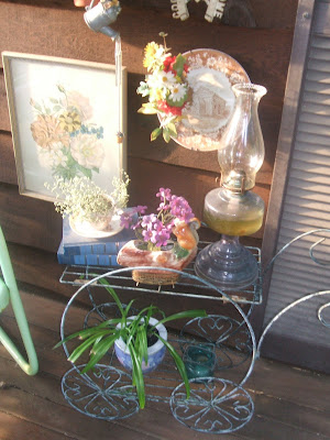 Believe it or not I found this metal tea cart thru Publisher's Clearinghouse, of all places in 95'. It fits perfectly betwen the 40's style chair and front door. I love wind chimes so the little watercan has the tinies clear chimes when a breeze blows thru. The plate was a cracked $1 find at an antique place. It's a brown transferware commerative plate of Lincoln's Birthplace. As you can see the crack was hidden quite nicely with faux red geraniums and other flowers and foliages. Last year I found the matching cup and saucer for $3 in great condition. I filled with with some Thyme. It sits atop a stack of old Reader Digest books. Faux violet fill a 1940's ceramic log with squirrel planter that has a metal gold-tone bottom still attached...usually those are missing. The blue oil lamp is another vintage gift from my MIL. I love the blue glass bottom, but the lamp top was alos blown off, so a new one will replace it. Oh I almost forgot the vintage floral print from the 30-40's that hang on the wall too. I love the watercolors of reds, yellows, and pinks. I found some others and they will join this one. Yes...I use them outside...I figure this is an 'outdoor' room and every 'room' needs a little artwork.